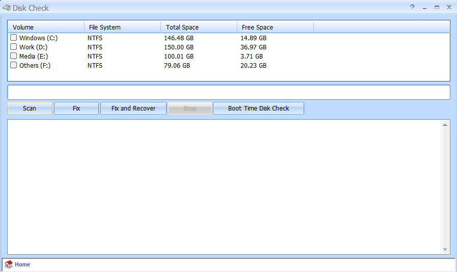 Disk Check is a free utility that can help you scan your disk drives for errors and fix them. It can also scan entire disk for bad sectors and try to recover them.